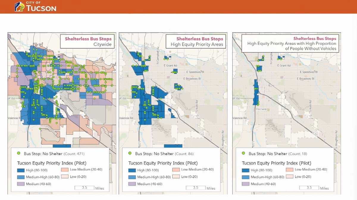 For example, city leaders are eager to use the Equity Priority Index to decide where to construct bus stop shelters. Shade is a commodity in Tucson, with minimal tree canopy and temperatures often exceeding 100 degrees. Since each bus stop shelter costs $30,000, thoughtful prioritization and preliminary analysis are critical. By overlaying bus stop locations against high-priority equity areas that also have a high proportion of people without cars, planners can identify bus stops in the neighborhoods where new shelters are needed most.