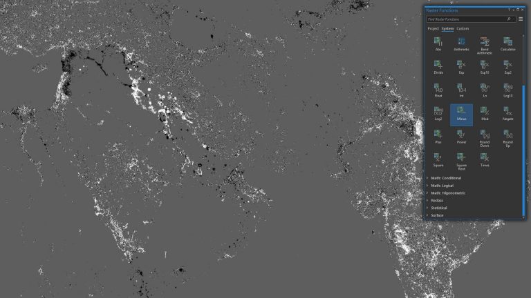 I opened both the 2012 and 2017 Earth at Night images in ArcGIS Pro and started investigating my options in the exceedingly fun and helpful Raster Functions toy box. I spotted a function named “Minus” which told me I could subtract the values of one image from the values of another. Perfect. Seconds later I was looking at a global map of change; black pixels marked areas of darkening and white pixels areas of new illumination.