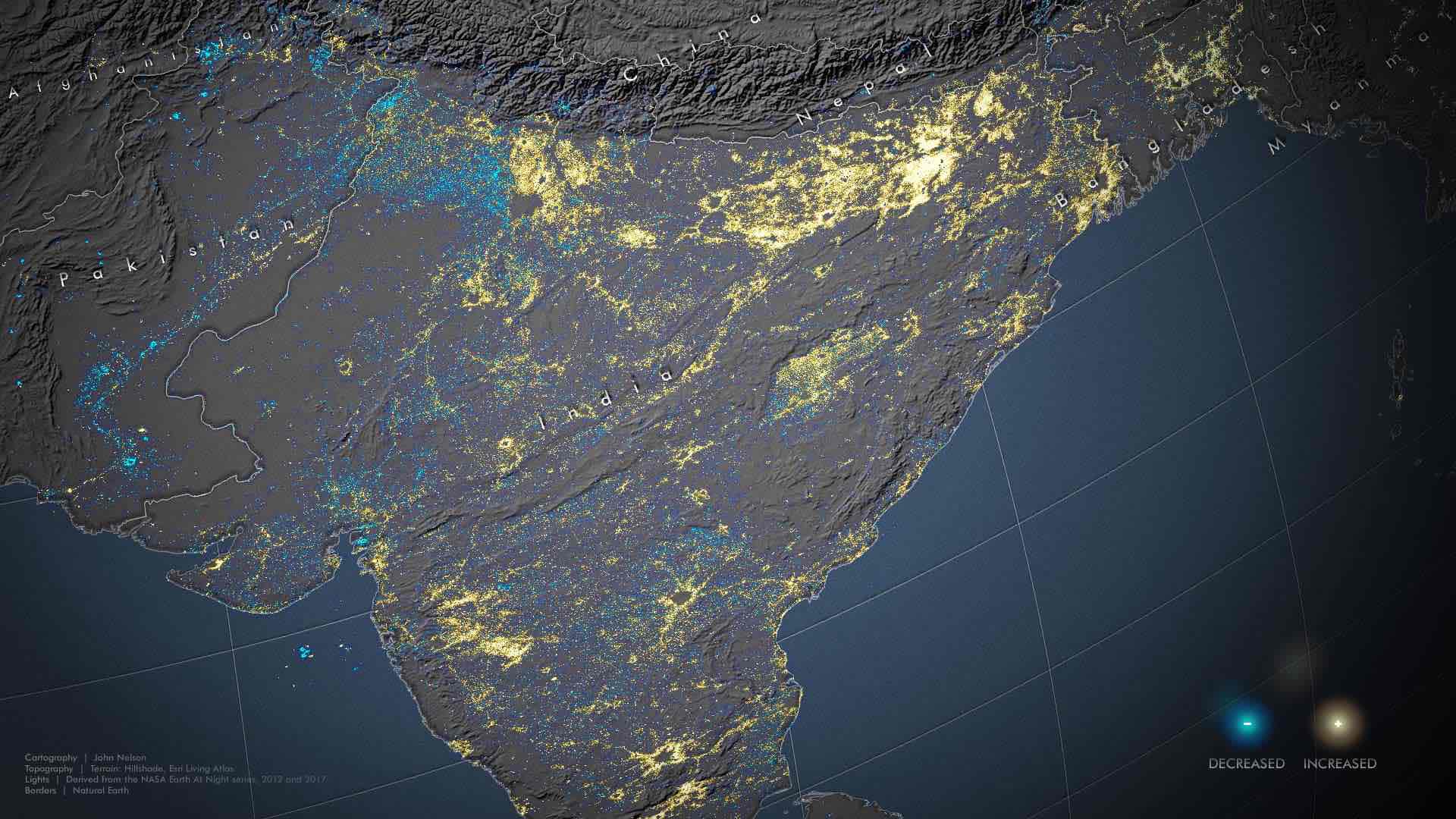 My eyes were immediately drawn to the newly-illuminated stretches of Northeast India. There, in the shadow of the Himalayan range, a vast network of light blazed where there was recently only darkness. This gave rise to questions I could not have thought to ask otherwise. I soon learned there was a massive investment in bringing electricity to the communities of this area. This new light represents a connectedness with the rest of the world and unknowable opportunities for education and improvement, a wave of optimism for millions of people.