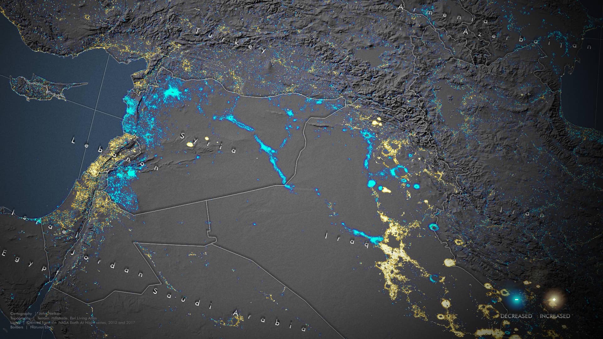 The duality of change, however, is most starkly apparent in the darkening of Syria. In the years between Earth at Night images, the violent conflict of the Syrian civil war has plunged an entire nation into absolute darkness. The night lights of population centers and the transportation systems that connect them have been wiped dark. Neighboring Iraq shows similar signs of conflict in its northwest, countered with massive new illumination throughout the rest of the country.