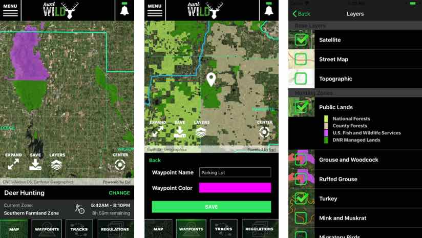 The Hunt Wild Wisconsin app tailors the experience based on the species the hunter is pursuing. Both satellite and topographic maps can be customized to save a favorite hunting location. Maps can be downloaded to the phone for access and use in areas without a cell signal. Hunters can also use the app to track themselves, helping them remember a trail and get back to their vehicle.