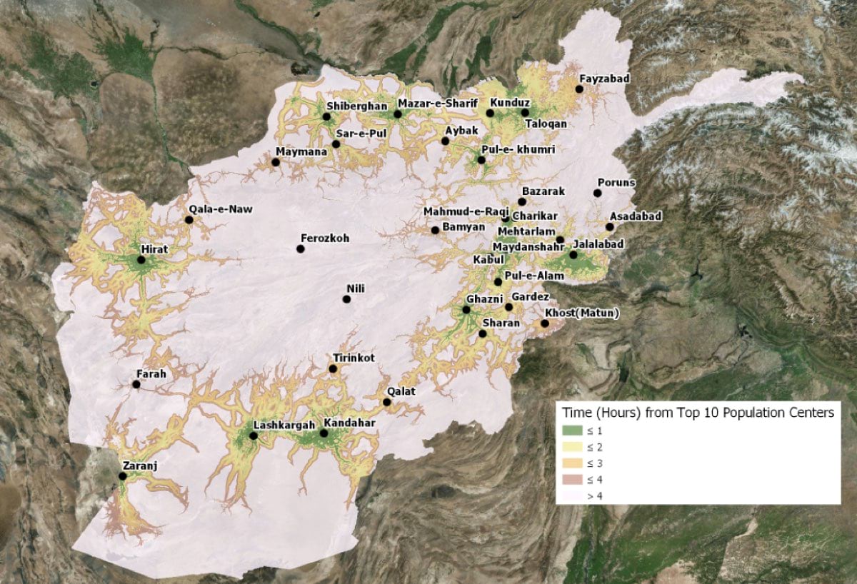 Now that World Bank staff have a more accurate road network for Afghanistan, they can run their mobility model against a large number of accessibility questions. The other side of the equation is capacity—not just how accessible a clinic or school is, for example, but how many people can be served there. This analysis helps determine whether, and where, more facilities are needed. And again, with spatial analysis, World Bank staff can help determine where best to site these new facilities.