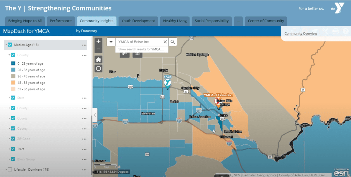 The Y-USA representative who took the call launched a dashboard on his computer and shared his screen. The dashboard displayed data from a geographic information system (GIS) that Y-USA makes available to every location. A map of downtown Boise appeared on the screen, including the Y in question.