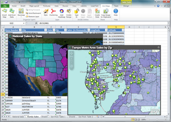 Esri Maps for Office, released in July, was another key new part of the ArcGIS Online ecosystem and part of the Esri Location Analytics product offerings. It’s a new analysis tool that allows business professionals to visualize data by creating and sharing interactive maps directly within Microsoft Office. Esri Maps for Office is a downloadable add-in for Microsoft Office 2010, available to ArcGIS Online subscribers, that empowers a new segment of users within an organization with GIS maps and capabilities. And perhaps more importantly, enables them to participate and contribute to core geographic assets.