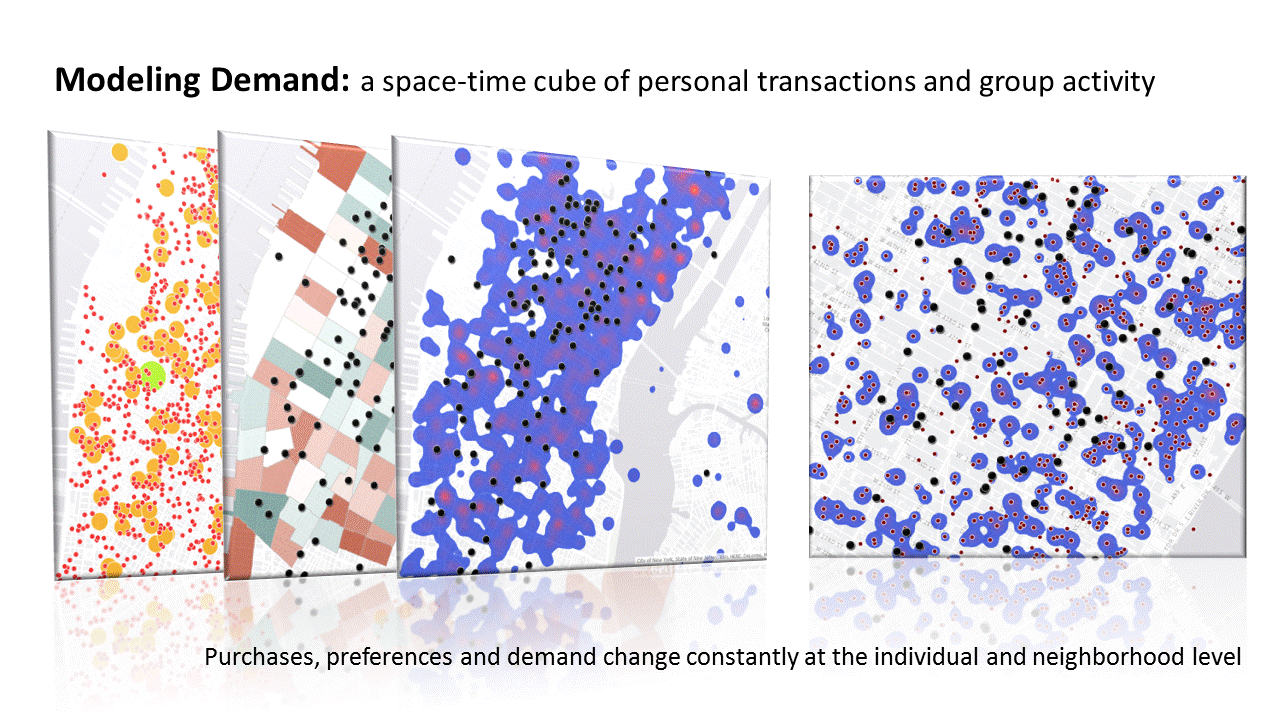 Geographic context provides insight into the billions of purchase transactions that take place every day. Through understanding the space-time cube of retail (where is something purchased and when), businesses can identify not only what is where and who needs it, but also market gaps and business opportunities.