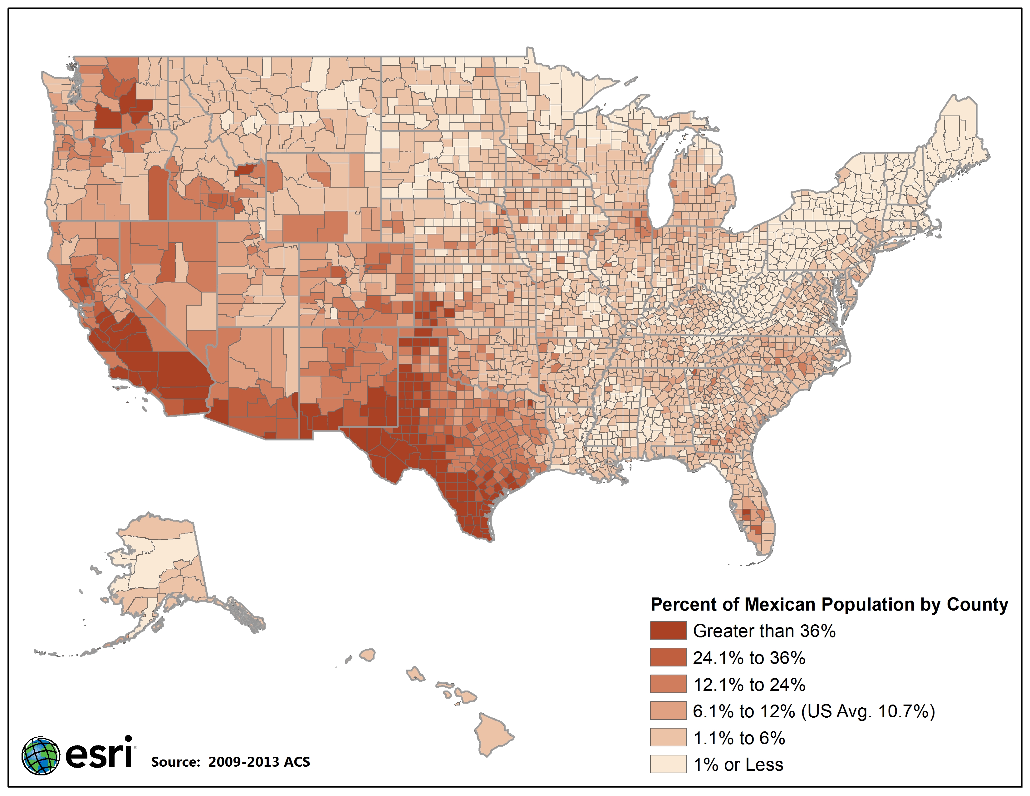 At nearly 34 million, Mexican Americans are a formidable presence in the US. They are living in every state and in nearly every county. As expected, counties in the border states of California, Texas, and Arizona, as well as New Mexico show the highest numbers of Mexican Americans. Starr County, Texas tops the list. The Mexican American population there is 59,339, or 96.7 percent of the total county population of 61,351. At the other end of the spectrum, small rural counties in the South, Midwest, Upper Midwest, and parts of New England show very low or no Mexican American populations.