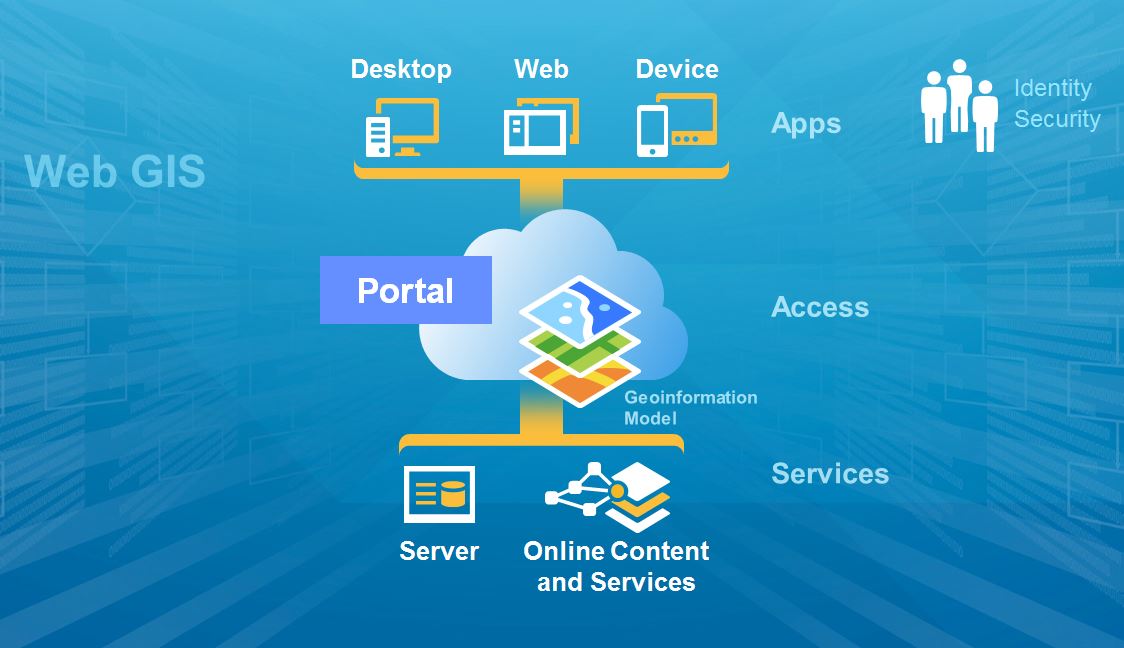 ArcGIS is an integrated Web GIS that is supported by services. These are abstracted in a geoinformation model that’s managed by the portal, and then accessible by a number of apps, which are the growing part of this system.