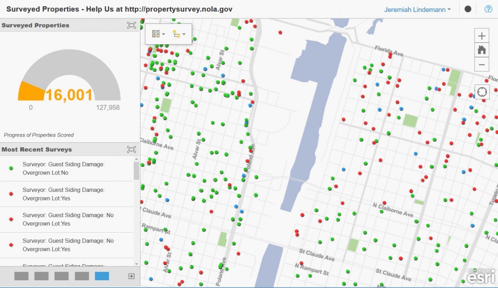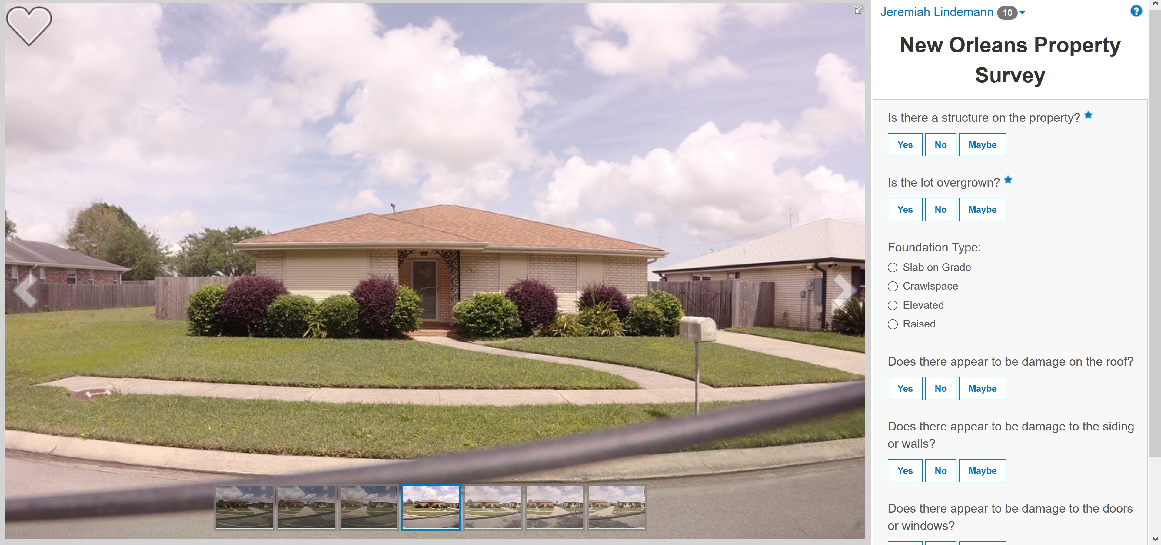 New Orleans is using the app to collect data about the status of the city’s 150,000 properties. To get started, staff drove every street of the city capturing photos of each building with two consumer grade cameras with wide angle lenses, which they bought from the local tech store. They also had an integrated GPS that tagged the location to each photo taken. They then uploaded the pictures to a data layer and joined them to corresponding parcel location data.