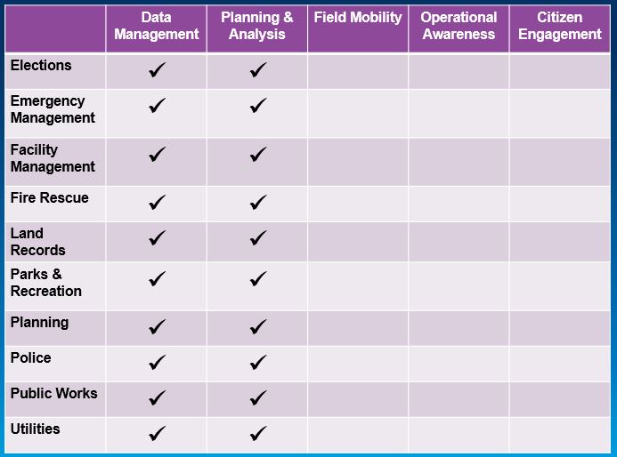 Then as we deploy solutions, we simply check off the boxes. For most existing GIS departments, they have already deployed solutions for Data Management and Planning & Analysis.