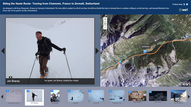 Story maps are very popular. They combine web maps, text, and rich media content to create compelling applications that inform, educate, entertain, and inspire people about a variety of topics. Many story maps can be lumped into the “fun” category–stories about personal journeys, vacations, adventures, and sightseeing across the globe. Here’s an example: Skiing the Haute Route: Touring from Chamonix, France to Zermatt, Switzerland: