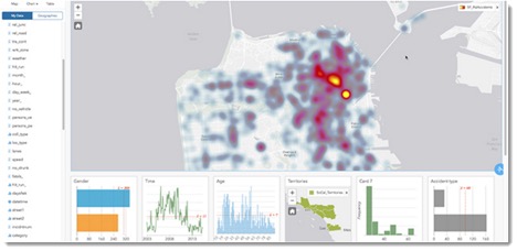 Insights for ArcGIS provides tools for spatial data exploration and understanding. Maps, charts, and tables appear alongside each other as cards. Each card is a live snapshot of the analysis. Apply a different style to each card and keep iterating. For an example, visit http://www.esri.com/products/arcgis-capabilities/insights.