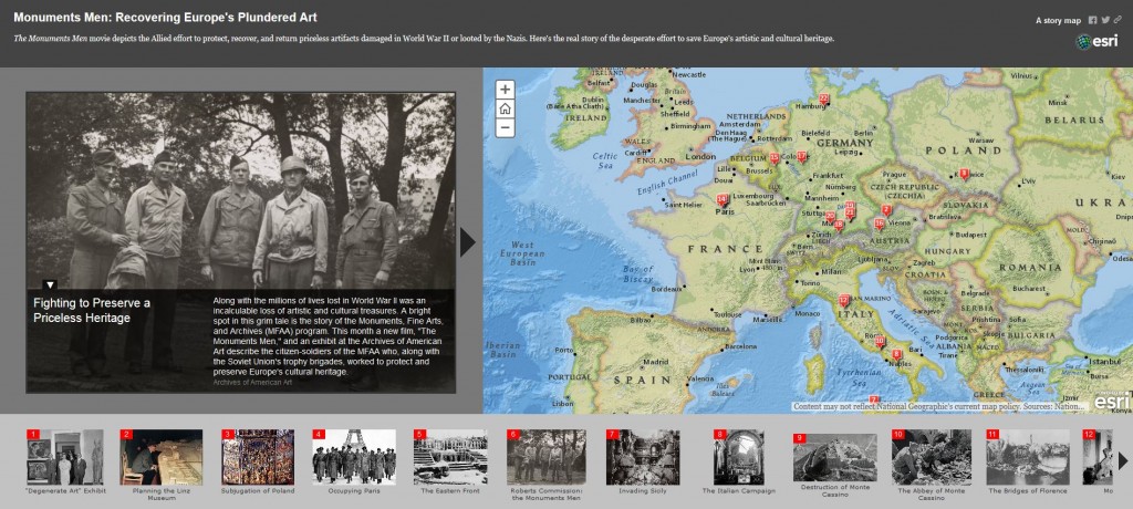 Coincident with the release of the movie “The Monuments Men,” Smithsonian Magazine published an article about the real story of this desperate effort to save Europe’s artistic and cultural heritage. In addition, a story map was produced by Esri’s story maps team in partnership with the Smithsonian Institution to help readers to better understand these heroic efforts in geographic context.