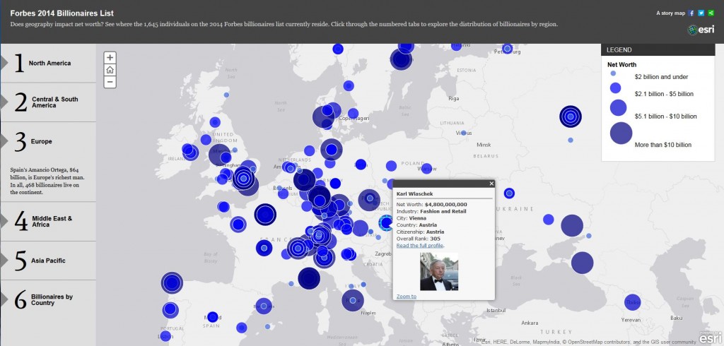 Does geography impact net worth? This story map lets you see where the 1,645 individuals on the 2014 Forbes billionaires list reside. You can browse through the numbered tabs to explore the distribution of billionaires by region, and then click on dots on the map to see more information about each billionaire.