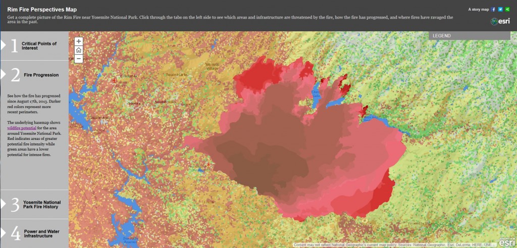 A number of media outlets, including Time Magazine, used an interactive story map to give their readers a more complete picture of the Rim Fire that started near Yosemite National Park in August 2013. The Rim Fire threatened many communities near Yosemite National Park and posed a potential risk to several ranger stations and sequoia groves.