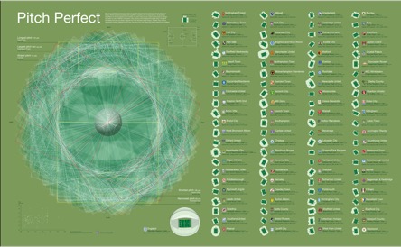 Dr. Field has also recently been honored by the British Cartographic Society, which gave him its top honor for an innovative map he presented at the society’s 2016 awards. The map illustrates the diversity in British football pitches (fields), showing the pitch dimensions and geographic orientations of 92 professional football clubs in England and Wales. Overlaying the centered and scaled aerial images of the pitches produced a spirographic pattern that was educational in showing how widely the pitches varied, and the information was unique in its presentation. “Purely by chance, the data created this beautiful kaleidoscopic image,” said Field. “I think the reason people liked it is that nobody had ever seen that kind of data handled and presented in that way before.”