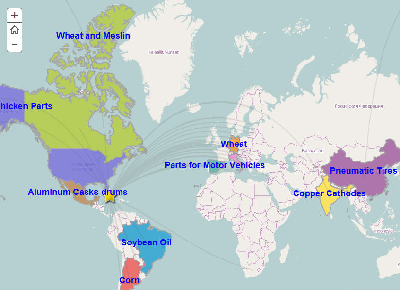 Now that we know the value of trade between countries, let’s look a little closer at what Cuba imports. As a small nation with limited agricultural land to support its population, Cuba relies heavily on imports from other countries. The top 10 import partners are shown with the most important product for each country.