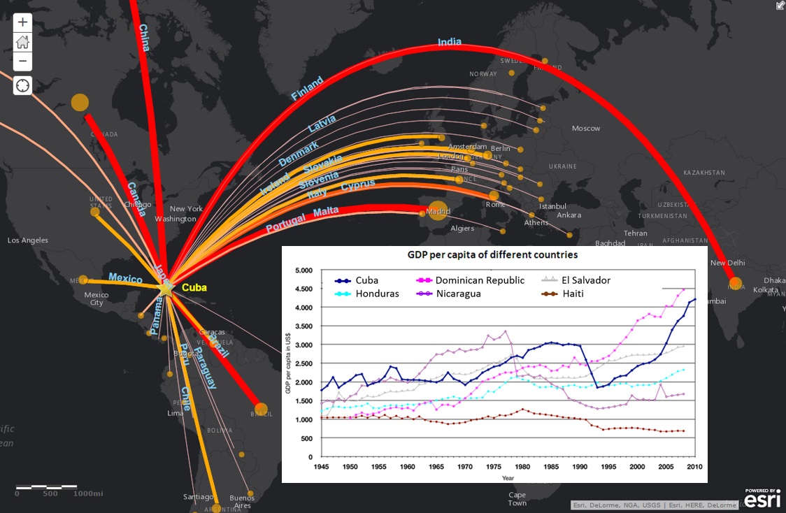 The most interesting map will come in the near future, as the United States opens up its doors to import products and services sourced from Cuba as well as exports more freely into Cuba. The last two tabs in the story map show economic data for the last year. What do you think will be in Cuba’s future? Will traditional partners from colonial times such as Spain be challenged by the close proximity of the American market? Only time—and most likely a map—will tell.