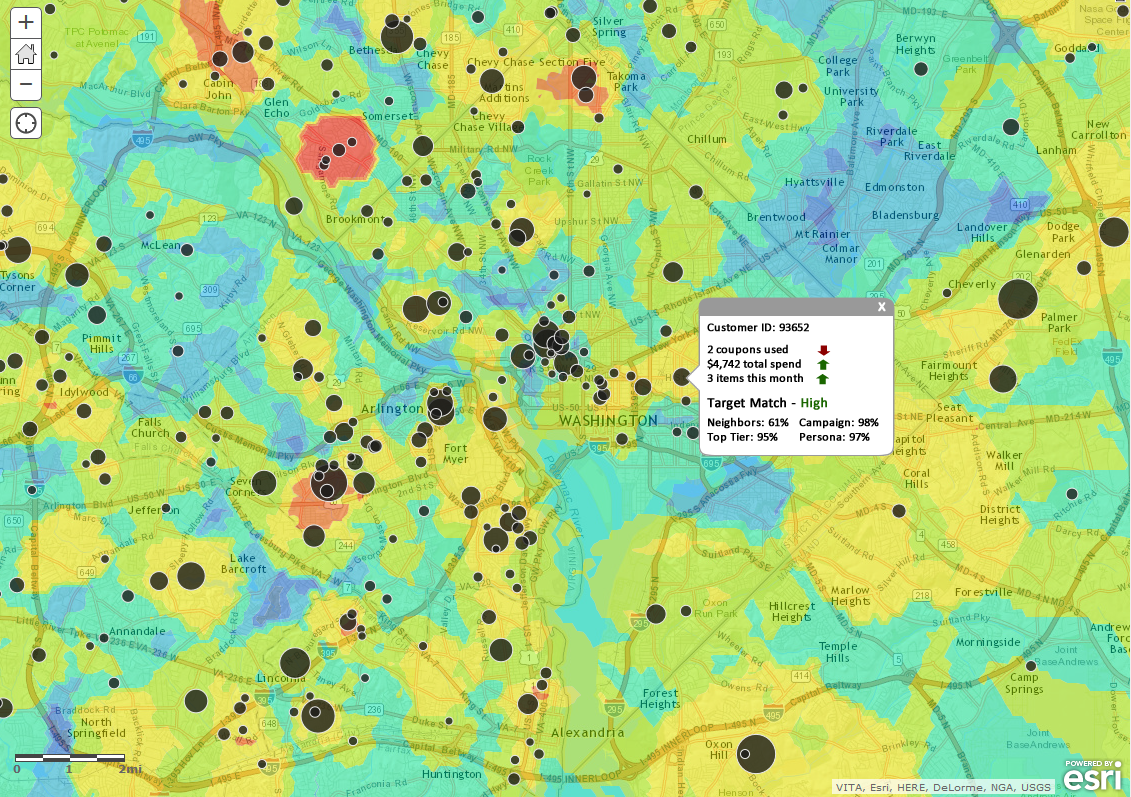 Take a look at the map above depicting customers in the Washington, D.C. Metro area. The background heat map is a predictive surface showing where we would expect to find the best customers, based on past purchasing patterns and the likelihood of all customers to respond to a campaign. The larger the circle, the more likely the chance that segment will buy the product.