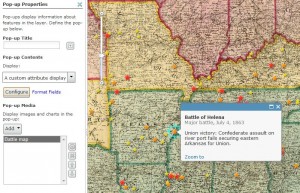 The web map was ready for its debut. But it needed a stage and a script with which to express its capabilities. In this case the “stage” is a JavaScript app that performs nicely in both browsers and tablets. We had already developed a “playlist” format that we had used in a story map about American watersheds. JavaScript virtuoso Stephen Sylvia adapted this format to enable a chronological listing of the battles. He also incorporated and refined a search capability that lets users find battles and type in state names, which neatly excludes all battles except those within the featured state.