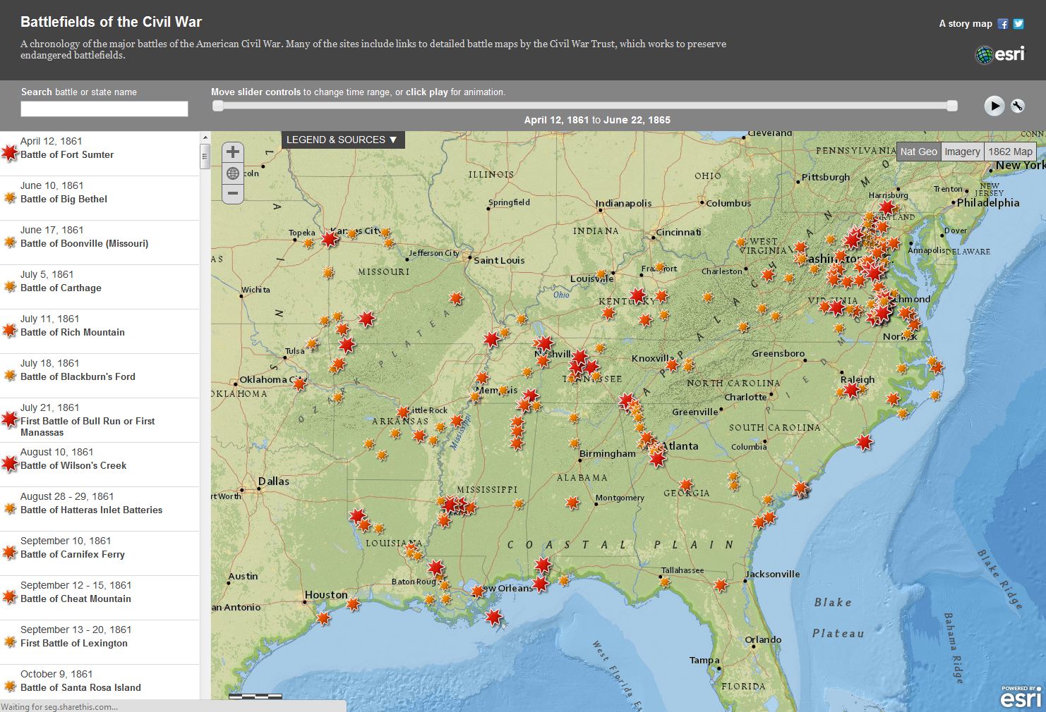 To build the story, we first created a web map. We compiled a spreadsheet of Civil War battles, using Wikipedia and the Civil War Trust as sources. We geo-tagged the battlefields by tapping POI Factory’s free database of GPS points. And, with the permission of the Civil War Trust, we added links to many of the dozens of beautiful battle maps that grace their