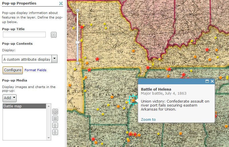 The web map was ready for its debut. But it needed a stage and a script with which to express its capabilities. In this case the “stage” is a JavaScript app that performs nicely in both browsers and tablets. We had already developed a “playlist” format that we had used in a story map about American watersheds. JavaScript virtuoso Stephen Sylvia adapted this format to enable a chronological listing of the battles. He also incorporated and refined a search capability that lets users find battles and type in state names, which neatly excludes all battles except those within the featured state.