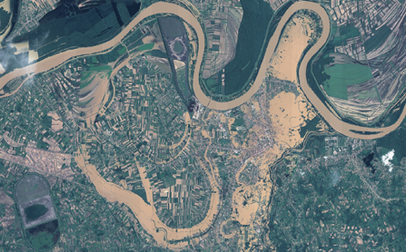 This comparison of two images in the west of Serbia shows two rivers overflowing extensively into the surrounding fields following a major flood in 2014. The towns of Krupanj and Obrenovac in Serbia are completely flooded. The ground and various parcels of land are completely hidden by water and mud. The image on the left is a TerraSAR-X radar image taken the night the flooding started, already showing breaches in the earthen dams, followed by an optical SPOT image (right) taken once the cloud cover reduced, and displaying the full devastation of the flood breach. © CNES 2013-2014, Distribution Airbus DS