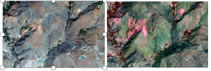 These views from near Tehran, Iran, show a natural color band image on the left and short-wave infrared (SWIR) image on the right. Note how one particular rock top pops out in pink using the SWIR bands and is not as easily discernible in the natural color band combination. The variation in rock types allows analysts to easily identify specific mineral patterns, greatly narrowing the search areas for particular materials.