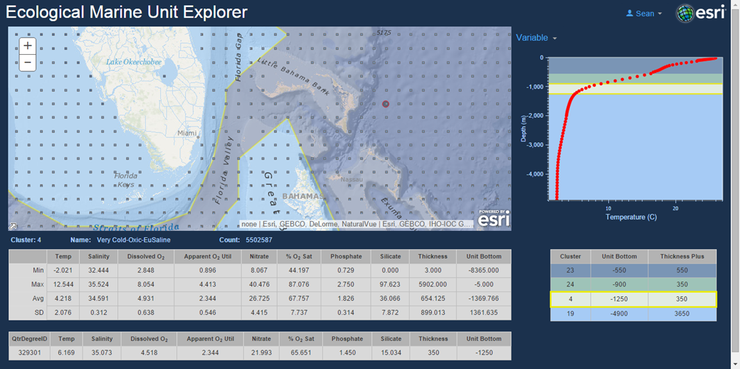 A map of marine ecology that is fully 3D and covers all of the oceans will make it possible for users to navigate through the ocean and observe what is happening to a wide range of ocean parameters such as salinity and oxygen levels as you explore from the surface down to the ocean floor. Thanks to the great work of Esri’s Sean Breyer, Chris Malke, Keith VanGraafeiland, and others we have a new web app called the EMU Explorer. It allows users to explore each of the ocean parameters involved in the EMU clusters by way of a horizontal plan view of those clusters at the ocean’s surface, as well as a vertical profile showing how the parameters change with depth. In the future we envision a 3D visualization app that allows the user to virtually “swim” through various environments seamounts, mangroves, and coral reefs while observing the statistical clustering and hence classification of many physical properties as matched to species distributions. In this way we hope to better understand how the physical ocean environment structures marine biodiversity.