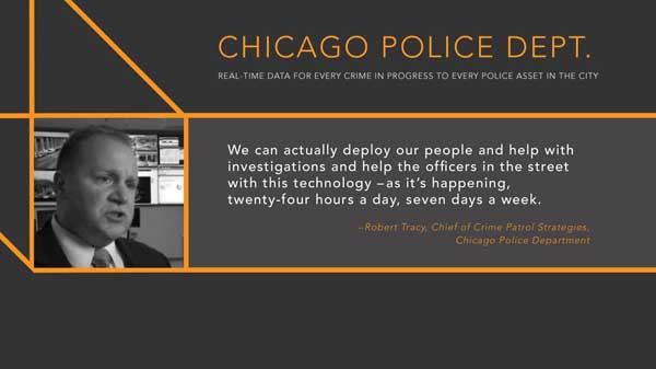 Before this new system was in place in Chicago, officers might have had to wait an hour to get the right information. Now they can get it immediately. This system provides a real-time look at every crime and incident in progress as well as the exact location of every police asset. Officers can also use the system to take control of any of the ~25,000 cameras available citywide. It’s designed to put the right information in the hands of police, where they need it and when they need it.