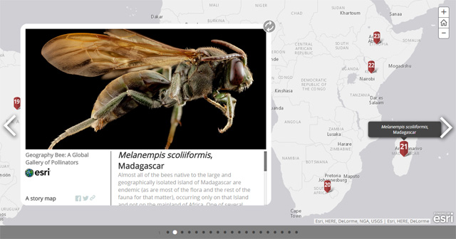 Many story maps start off as custom applications, and become available as templates that anyone can use later on. One of my favorites is Geography Bee: A Global Gallery of Pollinators, which enhances the compelling photography of USGS naturalist Sam Droegge by placing them into the context of a map. This template will become available later this year.