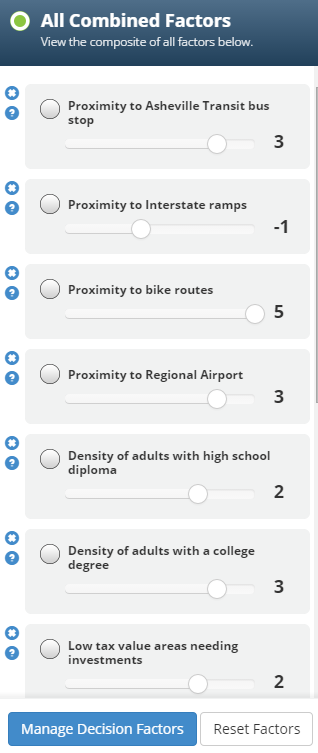 For example, varying the rank value of the same factors in Asheville’s Priority Places application results in multiple scenarios: