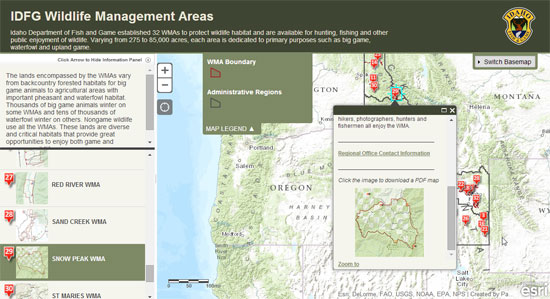 Another public information example, this one stands out because of the rich pop-ups it has been configured with, which include the ability for viewers to download PDF maps. This example uses the Story Map Playlist app.