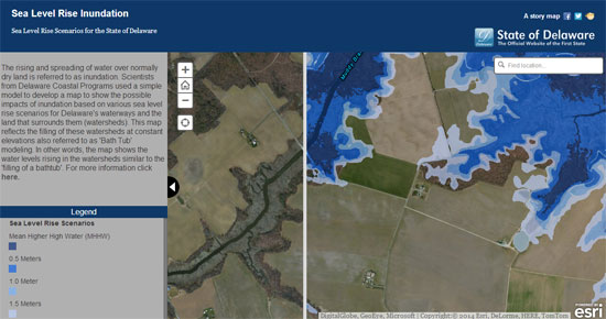 Using the Story Maps Swipe app this example shows the results of a sea level inundation model based on several rise scenarios. Story Maps provides an effective vehicle for communicating GIS analysis results to both decision makers as well as the public. The Swipe app effectively shows the results of the analysis, and is easy enough for anyone to use to explore the analysis results.