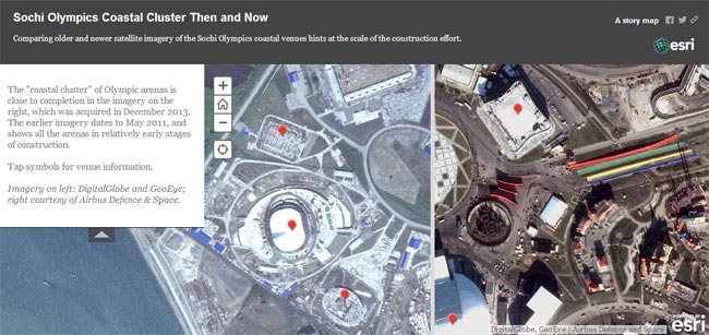Preparing for an Olympic Games is a huge undertaking, typically involving major construction projects needed to support venues, housing, and logistics. This story map compares imagery from May 2011 (from Digital Globe and GeoEye) with imagery from December 2013 (courtesy of Airbus Defence & Space). The massive construction effort is evident.