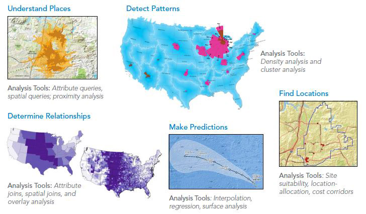 Spatial analysis is the most intriguing and remarkable aspect of GIS. Using spatial analysis, you can combine information from many independent sources and derive new sets of information (results) by applying a sophisticated set of spatial operators. This comprehensive collection of spatial analysis tools extends your reach toward answers to your questions. Statistical analysis can determine if the patterns that you see are significant. You can analyze various layers to calculate the suitability of a place for a particular activity. By employing image analysis, you can detect change over time. These tools and many others, which are part of ArcGIS, enable you to address critically important questions and decisions that are beyond the scope of simple visual analysis. Here are some of the foundational spatial analyses and the ArcGIS tools that get them done.
