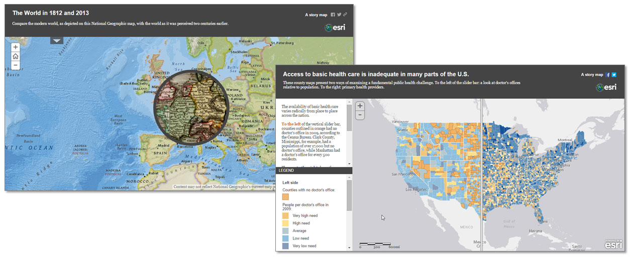 Yet another example is the very first story map, one comparing the geography of Fort Sumter during Civil War times to today. This first story map used Flash to animate the comparison of the two maps using a slider. Since then, the slider concept has been institutionalized as the Story Map Swipe template.