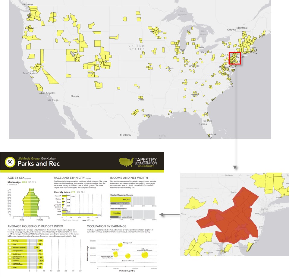 If your business offers products related to outdoor activities, you can select an area that you want to target and run a Tapestry Segmentation report. This will give you insights into the consumer profile for your target market. For example, the top most Tapestry segmentation profile for multiple counties around Greater Philadelphia, where residents are interested in pursuing outdoor activities, is mainly GenXurban. These families are practical suburbanites who own homes, may be two-income married couples approaching retirement age; they are comfortable in their jobs and homes, and have the resources to support their children through school and college.