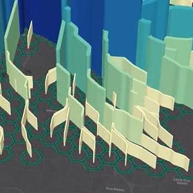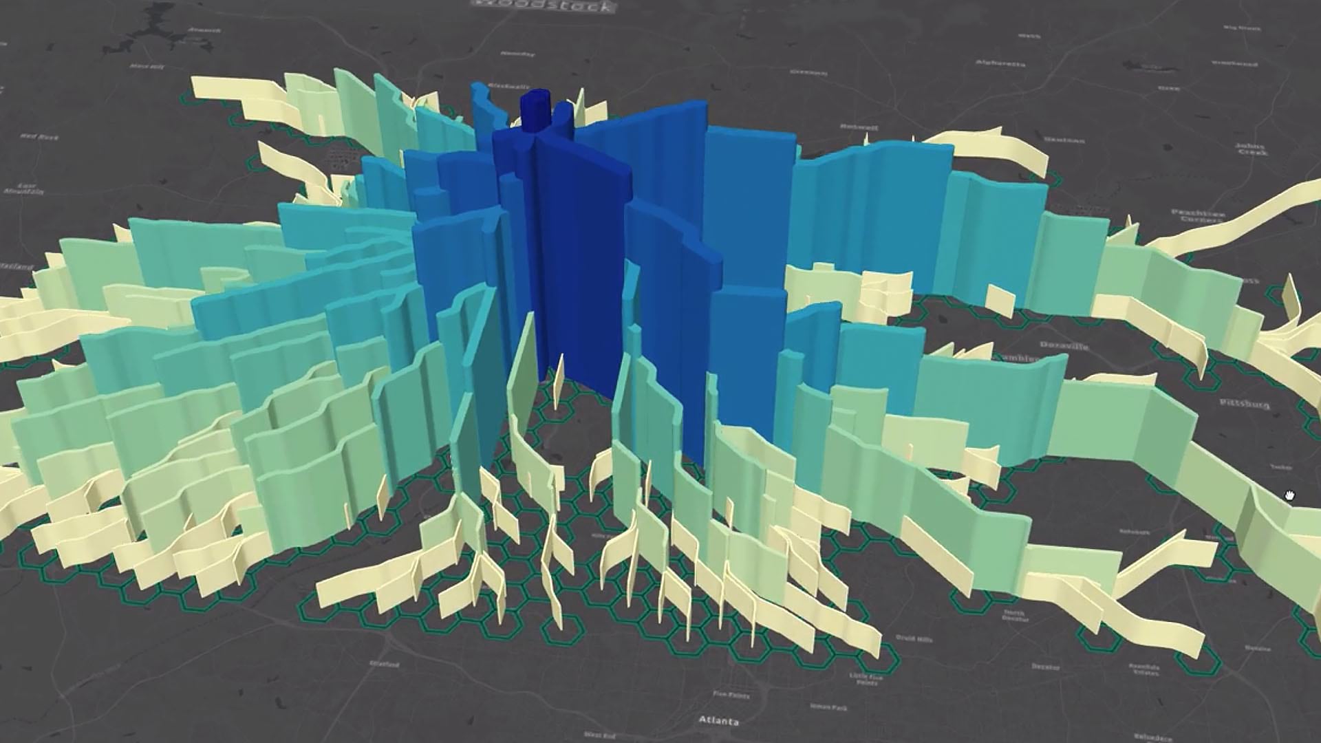 What it shows is the human equivalent of tracking rainfall through a river system. As more people use a given road, the height of the spine on the map grows. Feeder streams connect to tributaries, which empty into arteries, which lead to a destination—in this case, a mall.