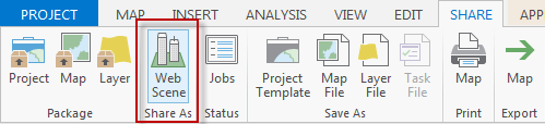 The final step is sharing this scene to my ArcGIS Online account which is as simple as using the Share As Web Scene button on the Share tab. ArcGIS Pro packages up your scene and publishes it to ArcGIS Online as a 3D web scene.
