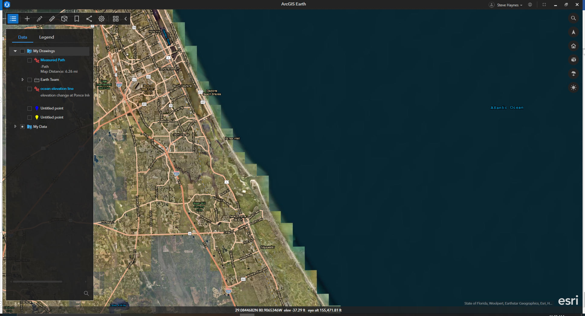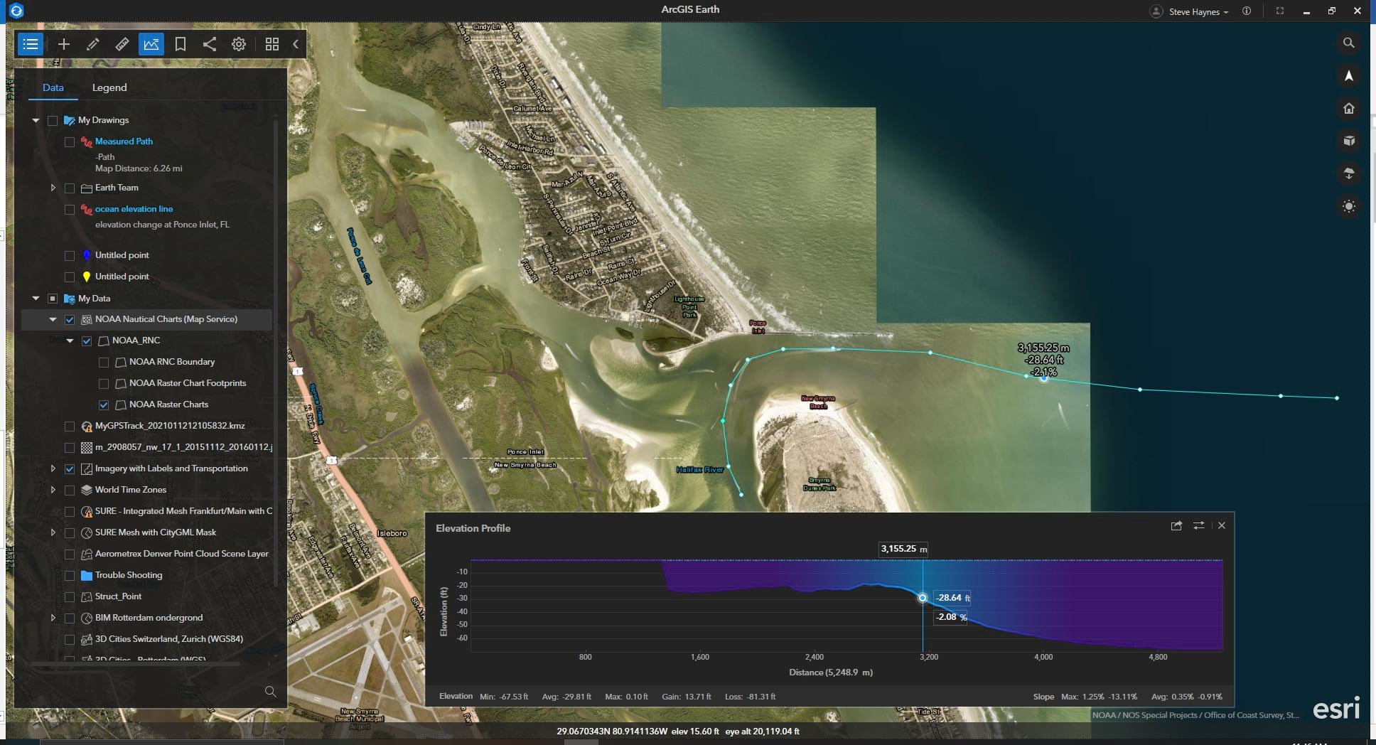 Terrain elevation above and below sea level can be analyzed and visualized in two different ways: the Explore Bar at the bottom of the window, and the Elevation Profile tool.