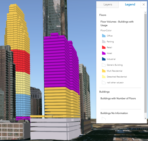 The January 2018 release of the Local Government 3D Basemap solution added the ability to create 3D floor features from existing 3D buildings. 3D floors can be used as input for creating 3D floor units or simply to visualize attributes per floor such as floor usage or floor occupancy.