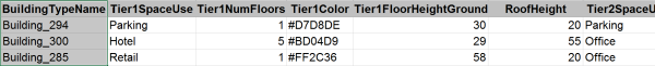 Floors can be created using a Building Space Use table where the building will be split into tiers or groups of floors, each with their own number of floors, floor height, space use, and color.