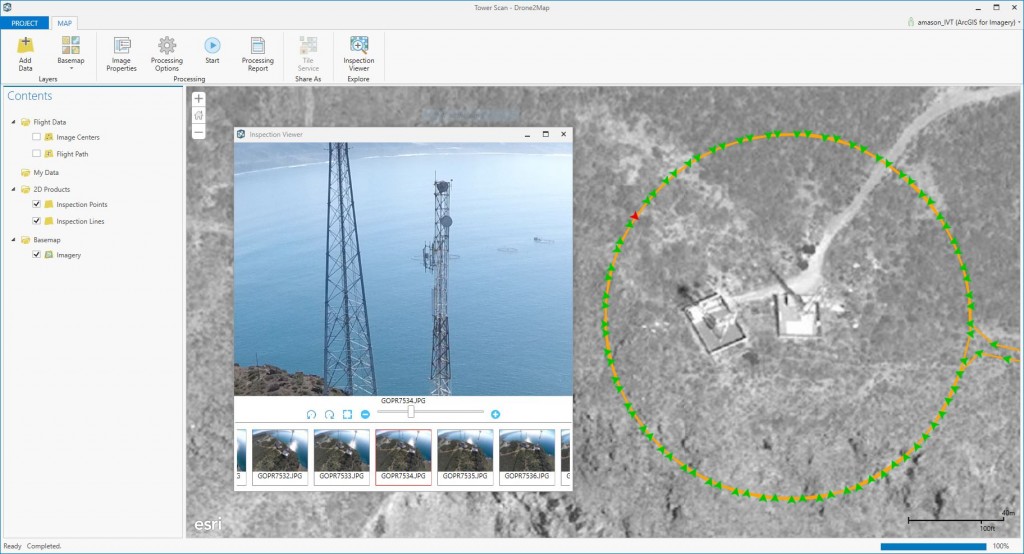 The Inspection template in Drone2Map quickly processes your drone imagery and orients each image to the object being inspected. This allows you to quickly click on the map to select a look angle instead of searching through hundreds of photos to find the angle you need.