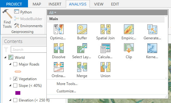 El geoprocesamiento proporciona un conjunto de herramientas para realizar análisis espacial y administrar data SIG de una manera automática. Una típica herramienta realiza una operación en un conjunto de datos y crea un conjunto de datos resultante de salida. Cuando encuentras la herramienta correcta de geoprocesamiento, especificas locaciones de entrada y salida de los conjuntos de datos, ajustas parámetros adicionales que afectan el proceso, y ejecutas la herramienta. Además de las herramientas que están construidas dentro de ArcGIS Pro, puedes crear herramientas personalizadas.
