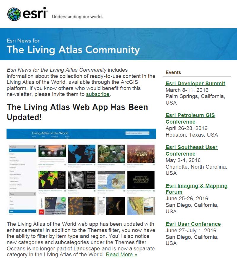 I encourage you to share this newsletter with others who may benefit from its content by inviting them to subscribe. Likewise, I invite you to contact me with feedback about the newsletter and what you would like to see in future issues. I am glad you have joined us in helping to build the Living Atlas of the World!