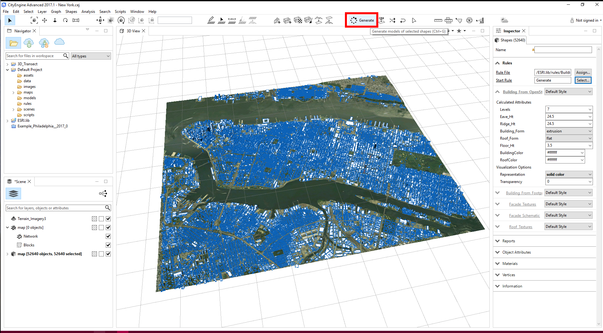 With the building polygons selected, click on the Generate button to apply the Open Street Map CGA rule.
