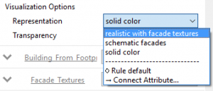 The buildings will automatically be extruded utilizing their attribute data. You can change the appearance of the city with different style types, as well as by changing the visualization from “solid color” to “realistic with façade textures”. This can be edited in the Inspector tab.