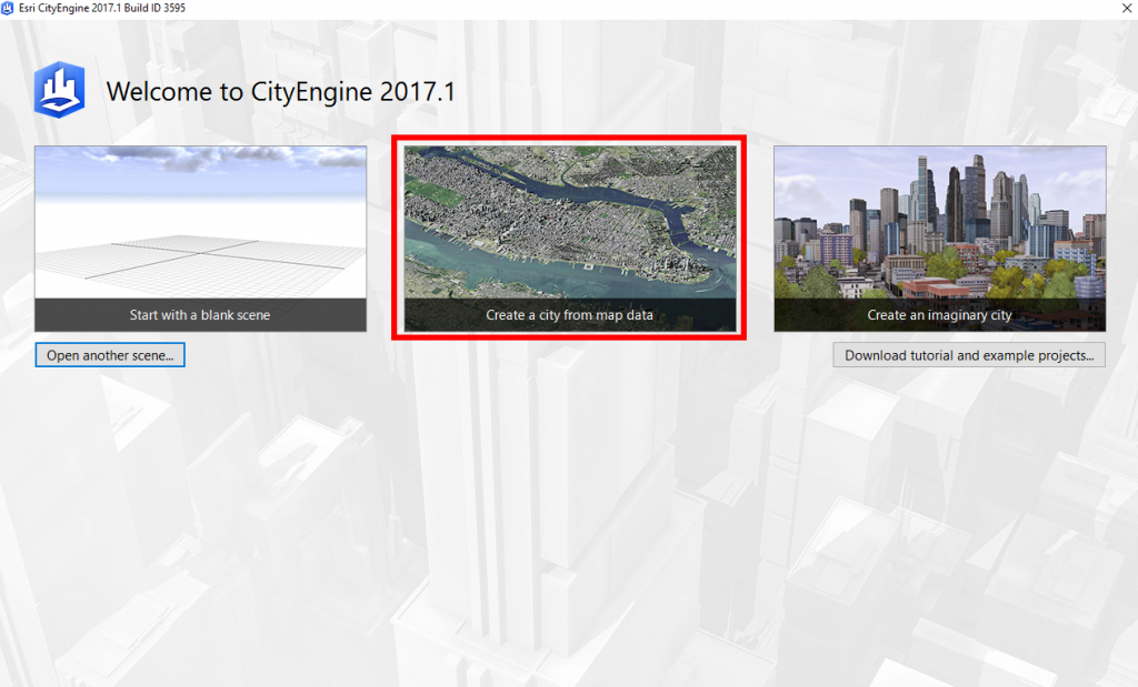 After downloading & installing the software, open CityEngine. The Welcome Wizard will appear, giving you the option to start with a blank scene, create a city from map data, and create an imaginary city. Since we don’t have data to work with yet, we want to create a city from map data.