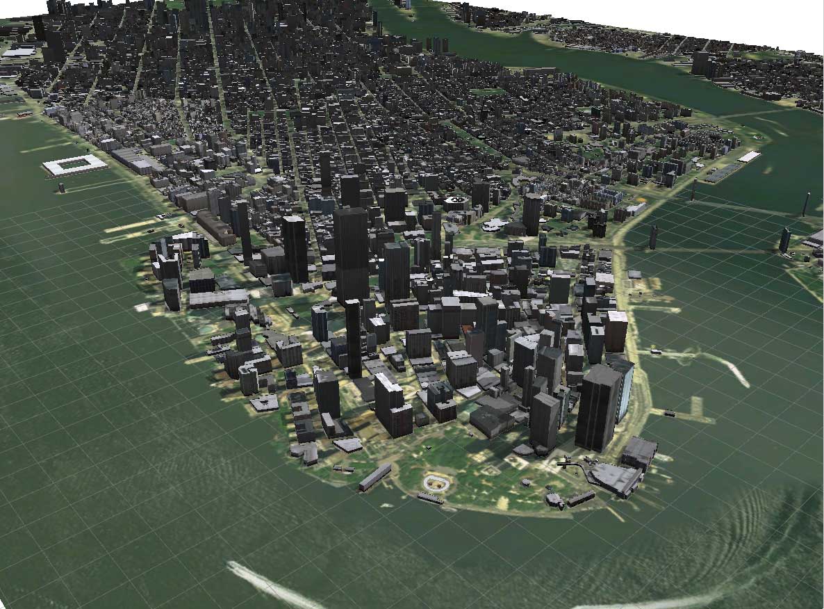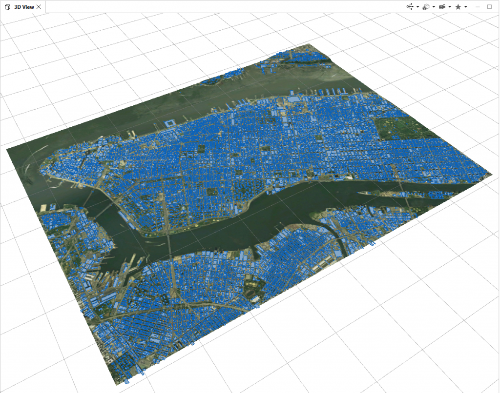 The terrain, imagery, and building footprint polygons will be automatically imported into your scene. The polygons are still in a 2D format, and need to have a rule applied to make them three dimensional.