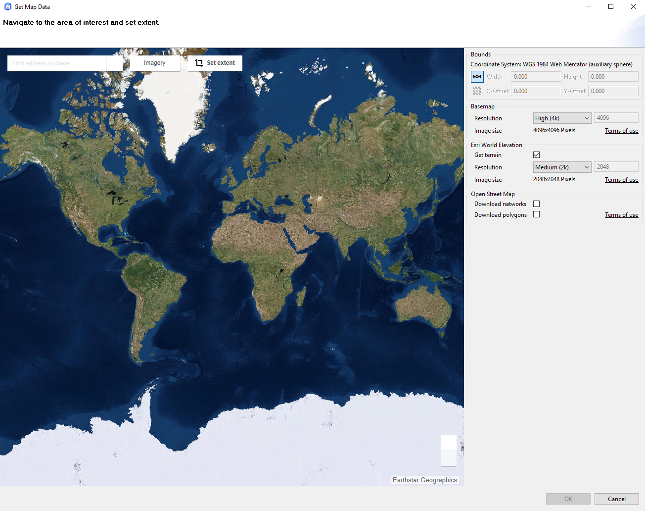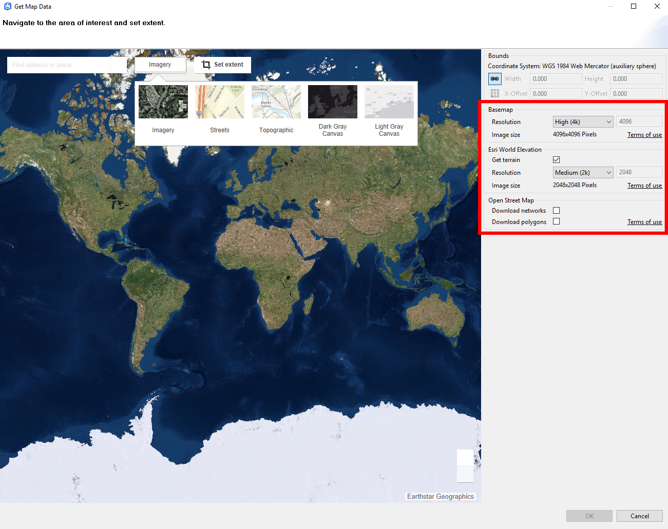 You may also want to edit the resolution of the basemap and world elevation that you’ll be importing. The panel on the right side of the Get Map Data viewer allows you to change the basemap resolution, along with the World Elevation resolution. The default for the Basemap resolution is High, and the default of the terrain download is Medium.